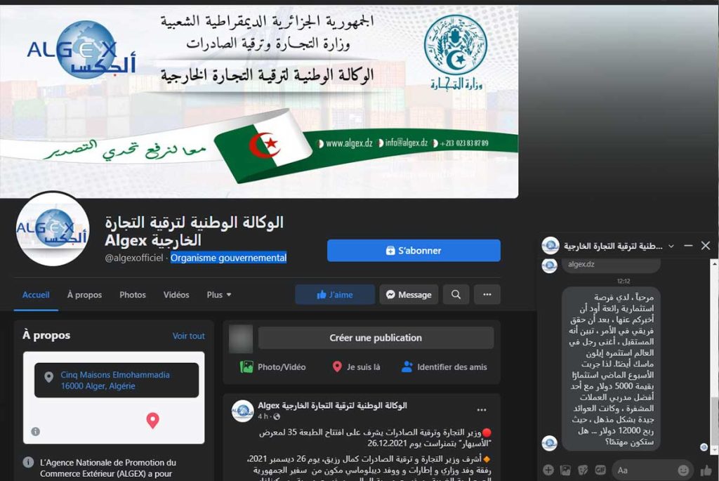 وقد استقبل اليوم موقع الصحفي رسالة عن طريق عن خدمة “الميسنجر” لفايسبوك مرسلة من طرف صفحة ” الوكالة الوطنية لترقية التجارة الخارجية @algexofficiel Organisme gouvernemental”.