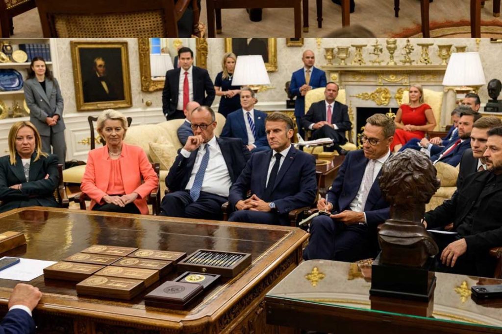الصورة التي التقطت في سياق اللقاء الذي تم بين الرئيس الأمريكي دونالد ترامب وفلاديمير زيلينسكي وقادة الاتحاد الأوروبي في البيت الأبيض.
