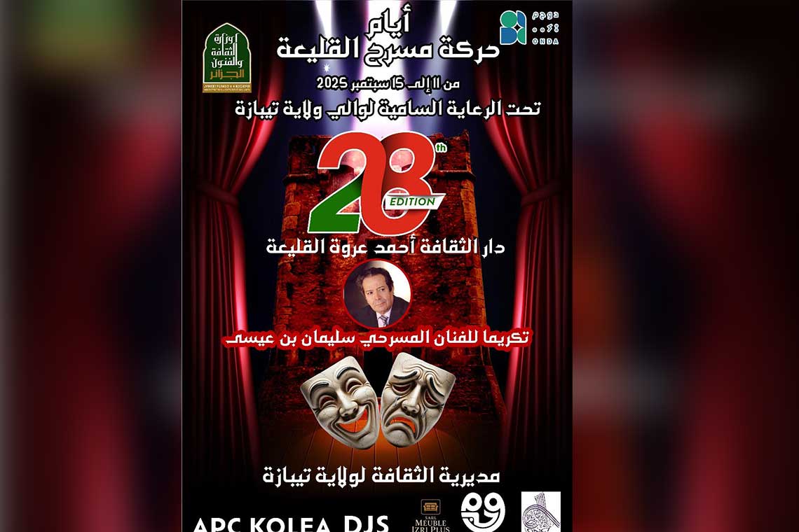 تنطلق يوم الخميس 11 سبتمبر بدار الثقافة والفنون د. أحمد عروة بالقليعة، ولاية تيبازة (الجزائر)، فعاليات الطبعة الثامنة والعشرين من الأيام المسرحية بالقليعة، لتستمر إلى غاية 15 سبتمبر، في موعد سنوي أصبح ثابتًا في أجندة عشاق الفن الرابع.