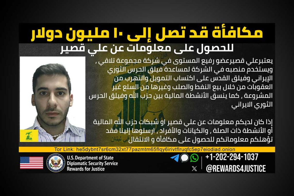 أدرج برنامج “مكافآت من أجل العدالة” التابع لوزارة الخارجية الأمريكية إعلانًا رسميًا يطلب فيه معلومات عن علي قصير، الذي يُعتبر من العناصر البارزة في شركة “مجموعة تلاقي”.