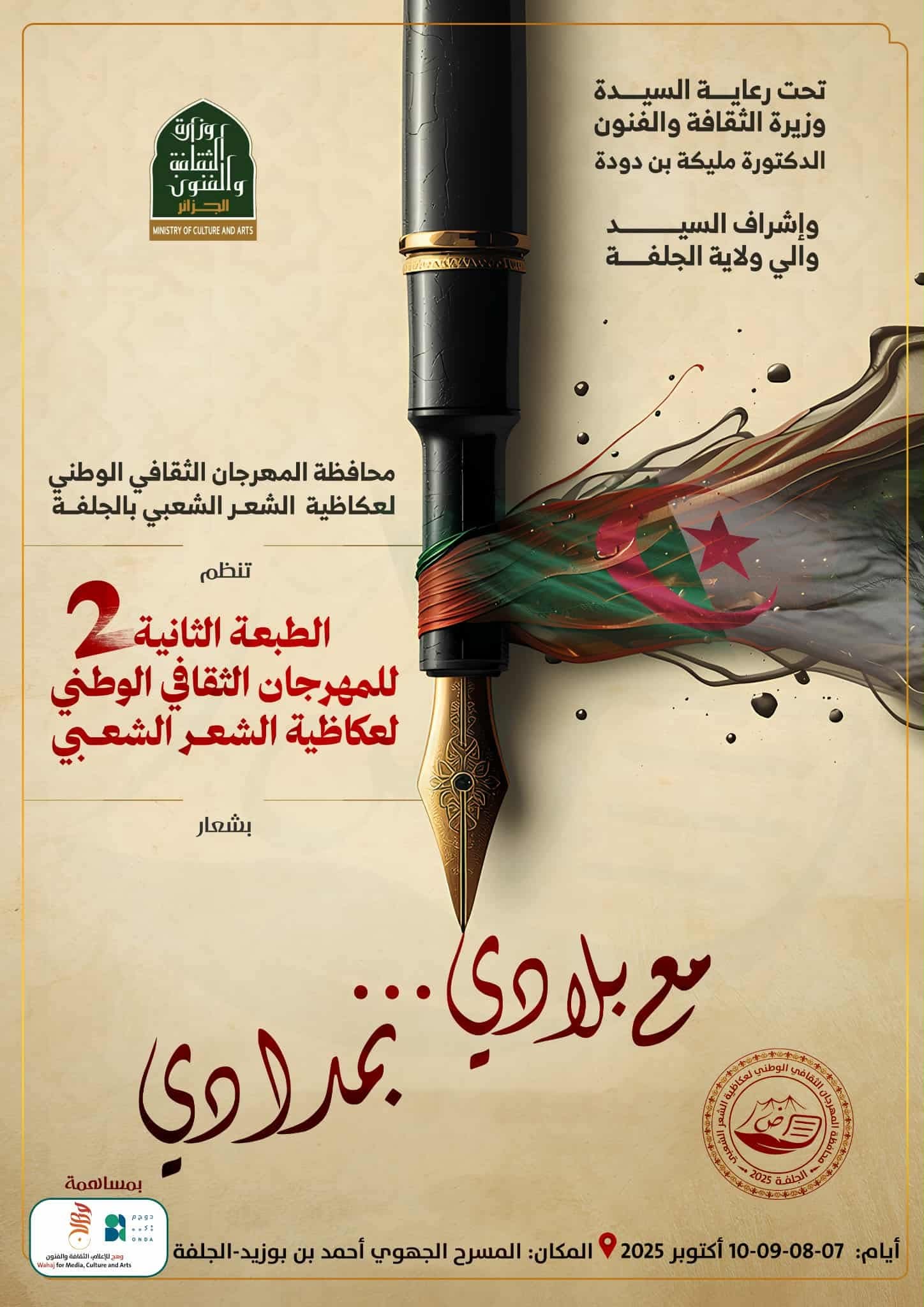 تستعد ولاية الجلفة لاحتضان الطبعة الثانية من المهرجان الثقافي الوطني لعكاظية الشعر الشعبي “مع بلادي بمدادي”، المزمع تنظيمه في الفترة الممتدة من 7 إلى 10 أكتوبر 2025، بالمسرح الجهوي أحمد بن بوزيد.