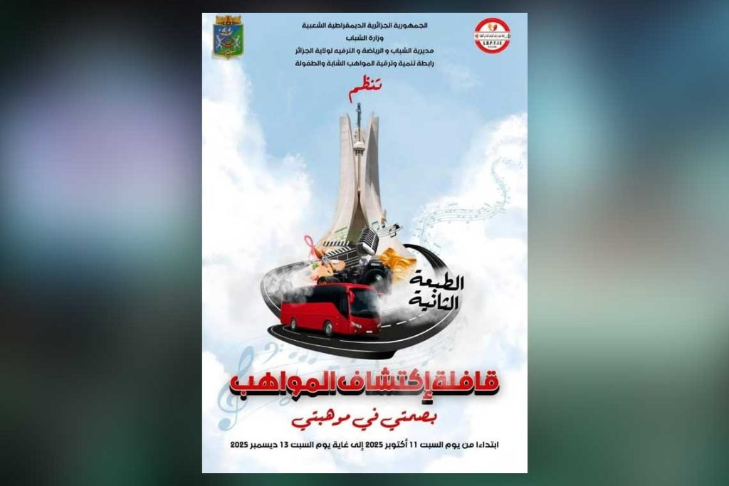 تننطلق في 11 أكتوبر بالجزائر العاصمة فعاليات قافلة “اكتشاف المواهب الشابة” تحت شعار “بصمتي في موهبتي”، لتكون منصة حيوية لاكتشاف الطاقات الشابة وإبراز إبداعاتهم في مجالات الفنون التشكيلية والدرامية والموسيقية والإعلام والتصميم الغرافيكي.