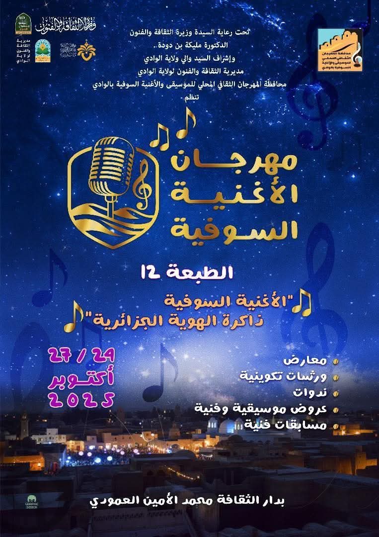 تحت شعار “الأغنية السوفية… ذاكرة الهوية الجزائرية”، تضرب ولاية الوادي، جوهرة الجنوب الشرقي الجزائري، موعدًا لعشّاق الطرب التقليدي والأغنية السوفية الأصيلة، من خلال احتضانها فعاليات المهرجان الثقافي المحلي للموسيقى والأغنية السوفية في طبعته الثانية عشرة.