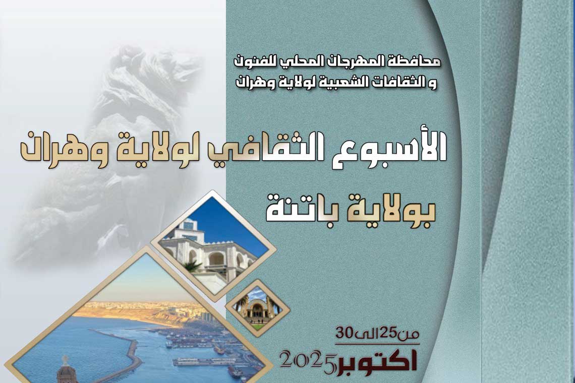 انطلقت بولاية باتنة فعاليات الأسبوع الثقافي لولاية وهران، الذي تنظمه مديرية الثقافة والفنون لوهران بالتنسيق مع محافظة المهرجانات المحلية للفنون والثقافات الشعبية، تحت إشراف وزارة الثقافة والفنون، في الفترة الممتدة من 25 إلى 30 أكتوبر 2025.