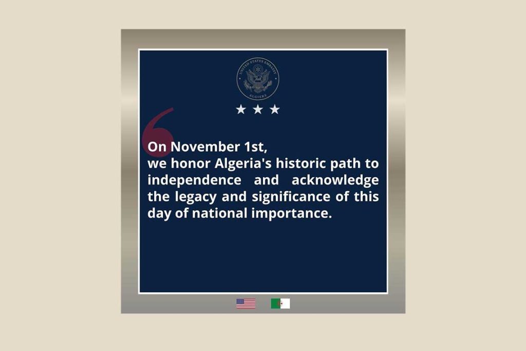 أحيت السفارة الأمريكية في الجزائر الذكرى الـ(71) لاندلاع ثورة أول نوفمبر، بتغريدة نشرتها على حسابها الرسمي في منصة “فايسبوك”، أكدت فيها تقديرها للمسار التاريخي الذي خاضته الجزائر نحو الاستقلال، واعترافها بما يحمله هذا اليوم من إرث ومعنى وطني عميق.