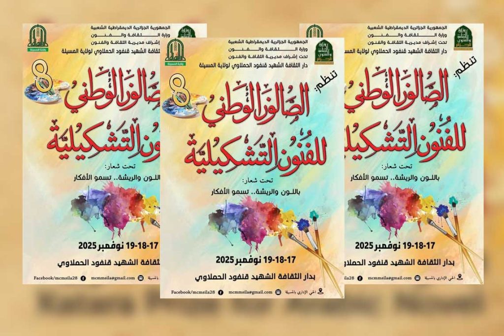 تستعد دار الثقافة “الشهيد مفعود الحملاوي” بولاية المسيلة لاحتضان فعاليات الصالون الجزائري الثامن للفنون التشكيلية خلال الفترة من 17 إلى 19 نوفمبر 2025، تحت شعار: «باللون والريشة.. تسمو الأفكار».