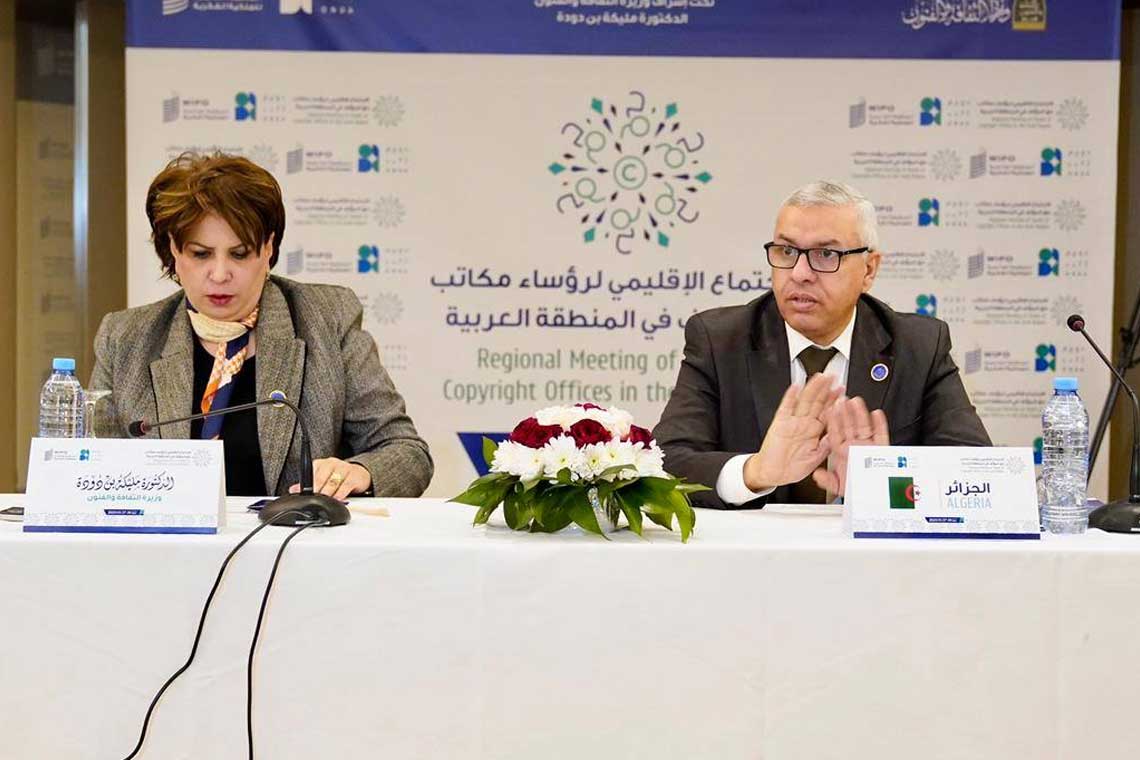 افتتحت وزيرة الثقافة والفنون الجزائرية، مليكة بن دودة، اليوم بفندق الماريوت – باب الزوار بالجزائر العاصمة، الاجتماع الإقليمي لرؤساء مكاتب حق المؤلف في المنطقة العربية، المنظم بالتعاون بين المنظمة العالمية للملكية الفكرية (الويبو) والديوان الوطني لحقوق المؤلف والحقوق المجاورة (أوندا).