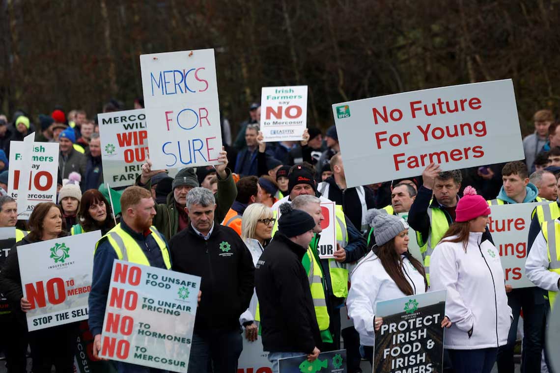 خرج آلاف المزارعين الأيرلنديين، اليوم السبت، في احتجاجات واسعة رفضًا للاتفاق التجاري المرتقب بين الاتحاد الأوروبي وتكتل ميركوسور في أمريكا الجنوبية، بعد أن منحت دول الاتحاد، يوم الجمعة، موافقة مبدئية على توقيع ما يوصف بأنه أكبر اتفاق للتجارة الحرة في تاريخ الاتحاد.