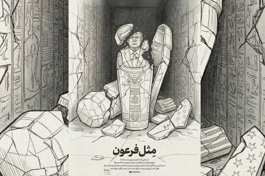 وجاء الرد على شكل صورة تمثال لترامب على هيئة مجسم فرعوني محطم، أرفقها بتعليق بالفارسية: “ذلك الأب الذي يجلس هناك متكبراً مغروراً، ويحكم على العالم كله، عليه أن يعلم أن المستبدين والمتغطرسين في العالم عادة ما سقطوا عندما كانوا في قمة غرورهم، وهذا أيضًا سيسقط، مثل فرعون”.