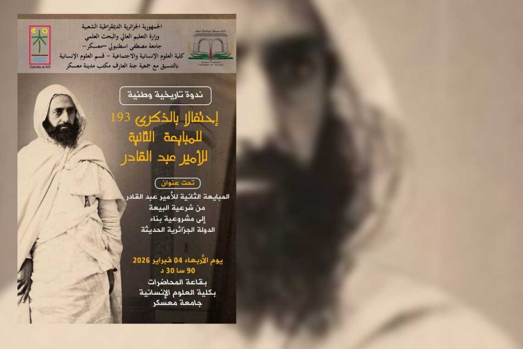 تنظم جامعة مصطفى اسطنبولي بمدينة معسكر بالجزائر ،ندوة وطنية يوم 4 فيفري 2026،ر، تحت عنوان: «المبايعة الثانية للأمير عبد القادر: من شرعية البيعة إلى مشروعية بناء الدولة الجزائرية الحديثة».